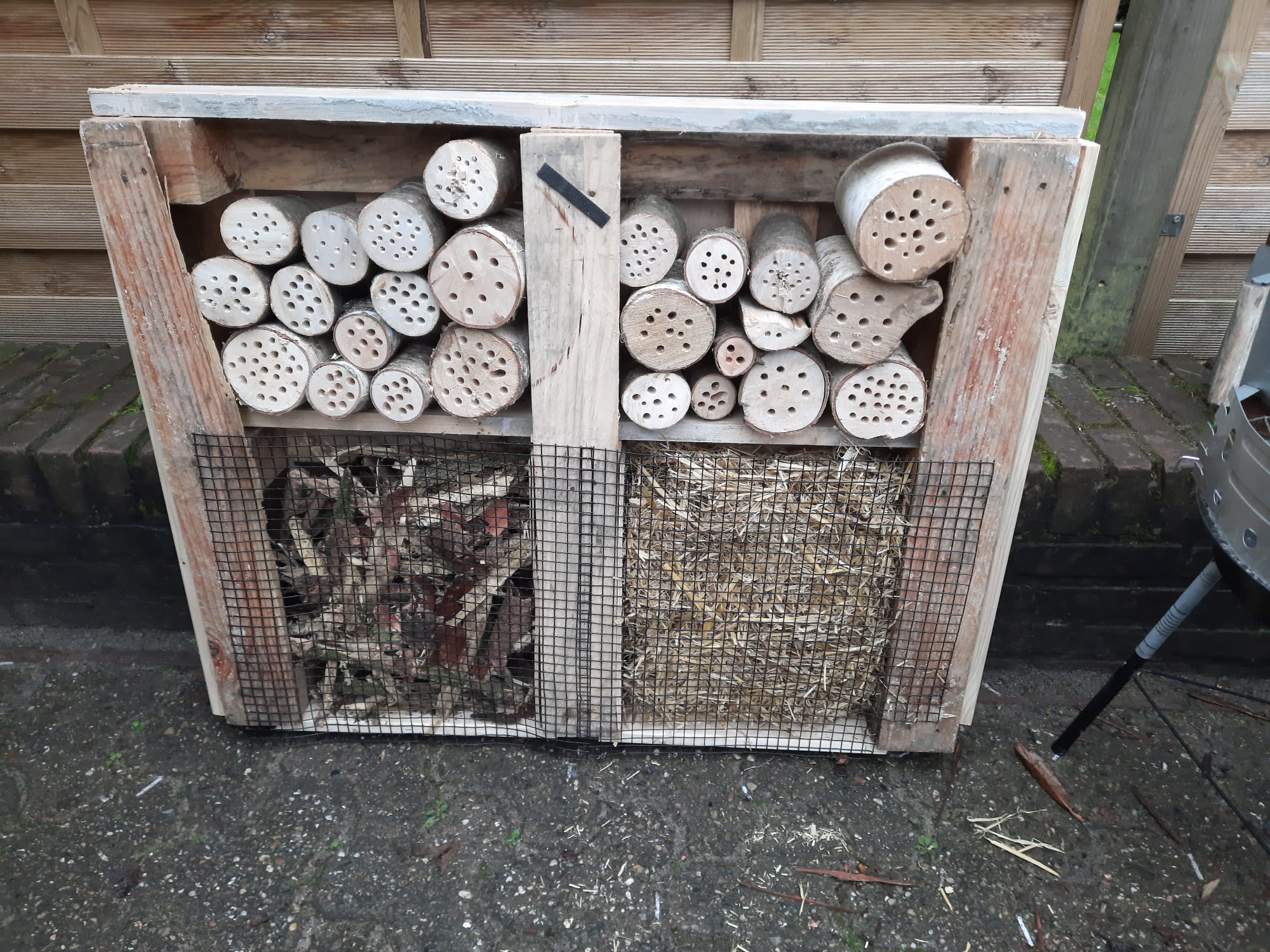 Das Ziel unseres Projektes war es, durch den Bau von Insektenhotels zum Einen bedrohten Insektenarten (wie z.B. verschiedenen Wildbienenarten) Brutmöglichkeiten zu schaffen und zum Anderen für den Bau der Hotels ausschließlich „Restmaterialien“, welche sonst höchstwahrscheinlich entsorgt worden wären zu verwenden. So dienten als Grundgerüste für die Insektenhotels alte Europalletten, die mit alten Hölzern verstärkt und abgeschlossen wurden. Die Zwischenräume haben wir mit diversen Naturmaterialien (z.B. alte Baumrinde, Stroh, Äste oder Holzklötze mit vorgebohrten Löchern) befüllt.